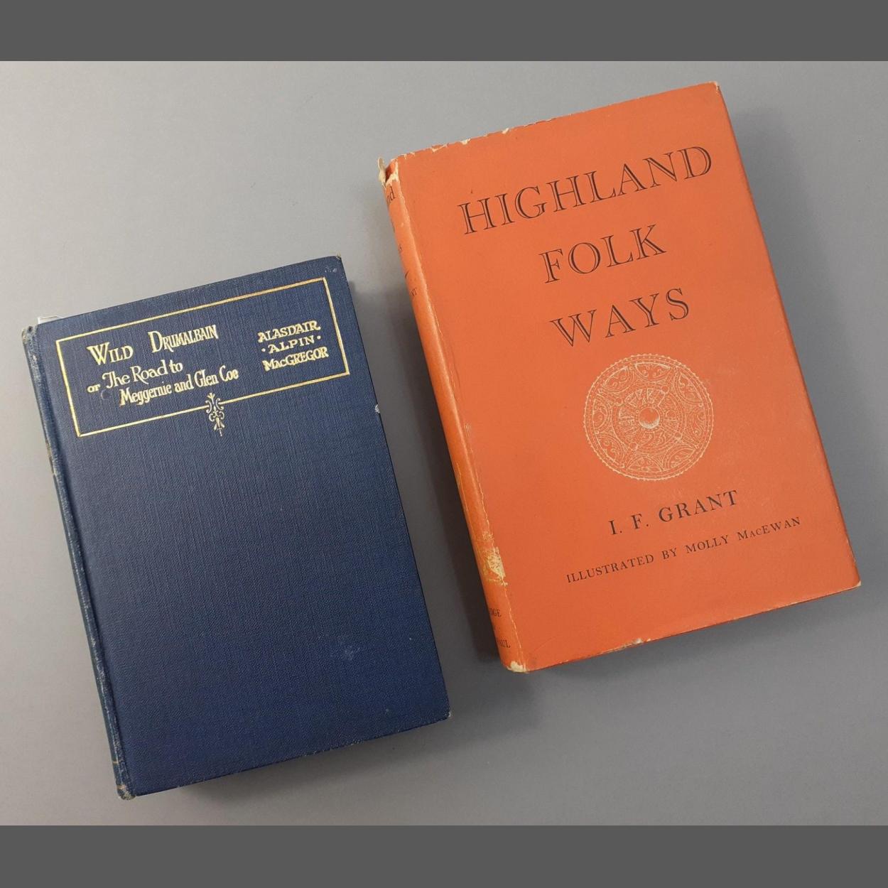 Two books of Scottish interest to include a first edition hardback copy HIGHLAND FOLK WAYS by I F GRANT, published by Routledge & Kegan Paul 1961, some rubbing to the dust jacket, generally good condition. Plus a hardback copy of WILD DRUMALBAIN or THE ROAD TO MEGGERNIE AND GLEN COE by ALASDAIR ALPIN MacGREGOR published by W & R Chambers, no pub date, believed first edition 1927, in good condition