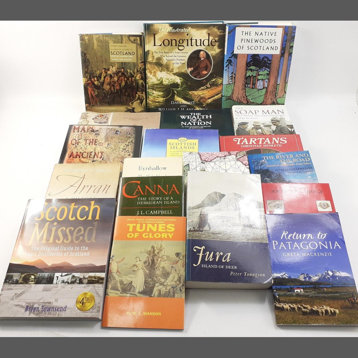 Two boxes of Scottish interest books to include SCOTLAND: Mapping the Nation by Christopher Fleet; SCOTCH MISSED: The Original Guide to the Lost Distilleries of Scotland by Brian Townsend; THE SOAP MAN: Lewis, Harris and Lord Leverhulme by Roger Hutchinson; MAPS OF THE ANCIENT SEA KINGS by Charles H Hapgood; THE WEALTH OF A NATION: in the National Museums of Scotland; first edition copy of CANNA: The Story of a Hebridean Island by J L Campbell plus others