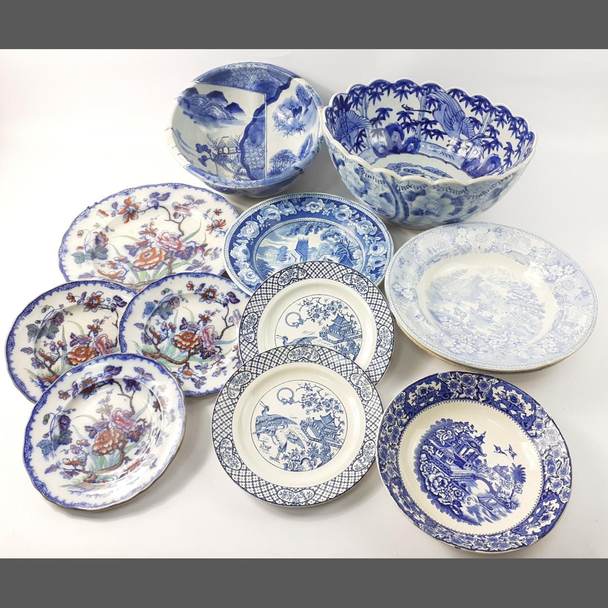 A collection of blue and white china to include a very large and heavy oval bowl with floral design 31cm long and 15cm high