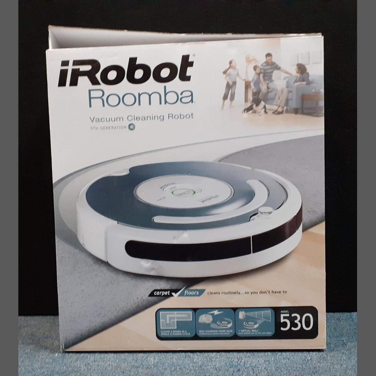 An iROBOT ROOMBA re-chargeable vacuum cleaner in box. Has been used