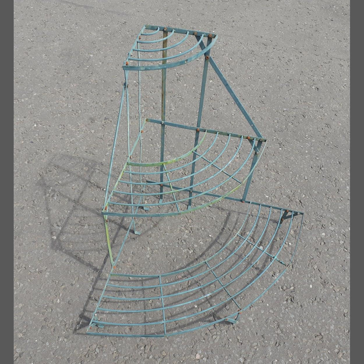 An older green metal corner three tier plant stand in good condition. An attractive and useful piece. Stands 74m tall and 85cm across at the base.