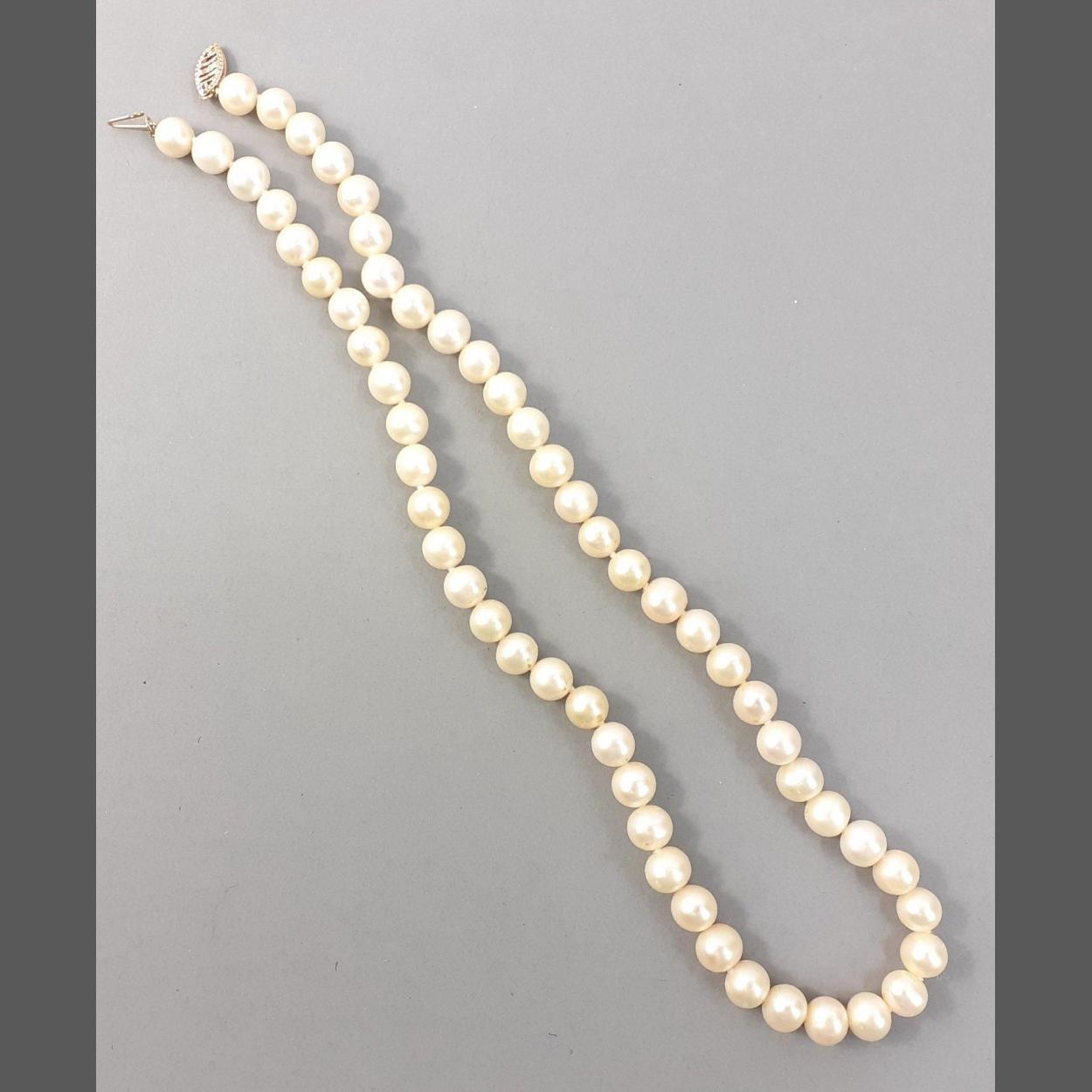 A string of natural pearls with a 14K clasp, 45cm long approx