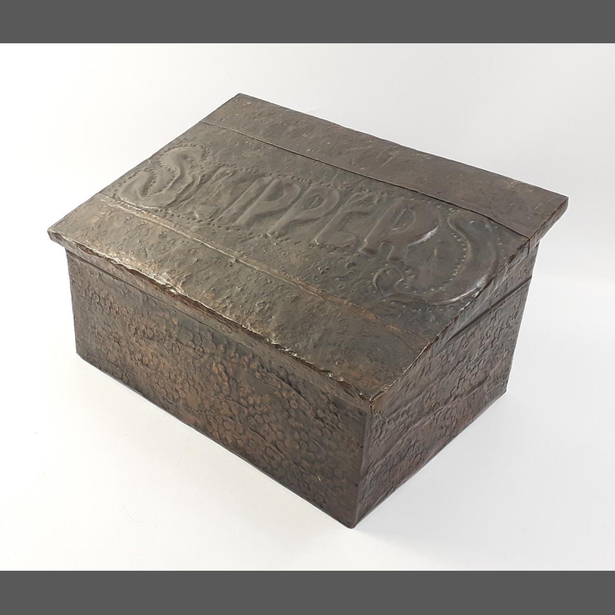 A lovely fireside slipper box, beaten brass outer with worn felt lining 36 x 25 x 20cm height at highest point.