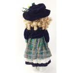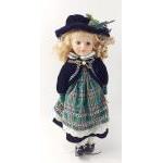 An NIGC doll with a tartan dress, velvet jacket, on a stand. Approx 40cm tall.