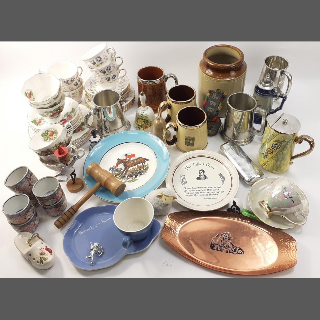 A mixed ceramic lot to include tea sets from Queen Anne and Richmond, 2 Dickens tankards, bier stein and various decorative items. An interesting lot
