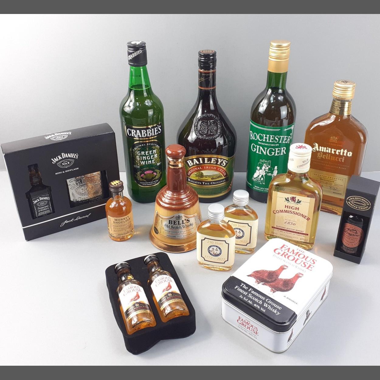 A mixed lot of alcoholic beverages to include 50cl AMARETTO BELLUCCI, a 1 litre bottle of BAILEYS, a bottle of ROCHESTER GINGER, CRABBIES GREEN GINGER, JACK DANIELS gift set, tinned GROUSE miniature, 20cl HIGH COMMISSIONER, MITCHELL'S OF CAMPBELLTOWN miniature and three other miniatures