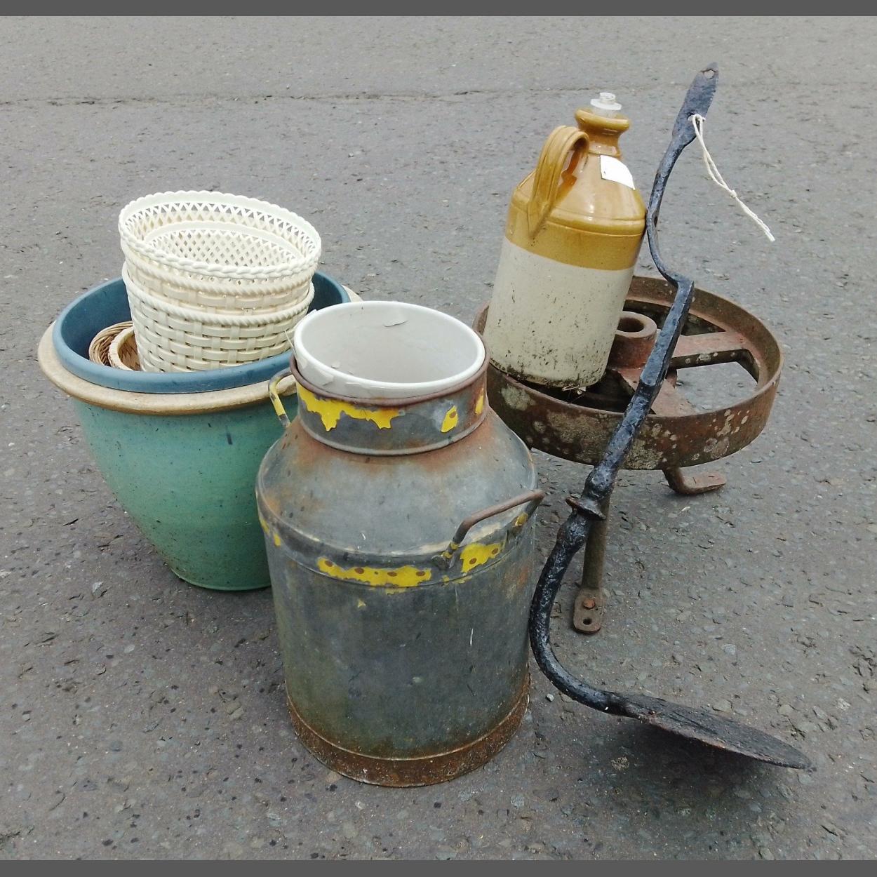 A mixed garden lot to include a milk urn, flagon and some plastic planters etc