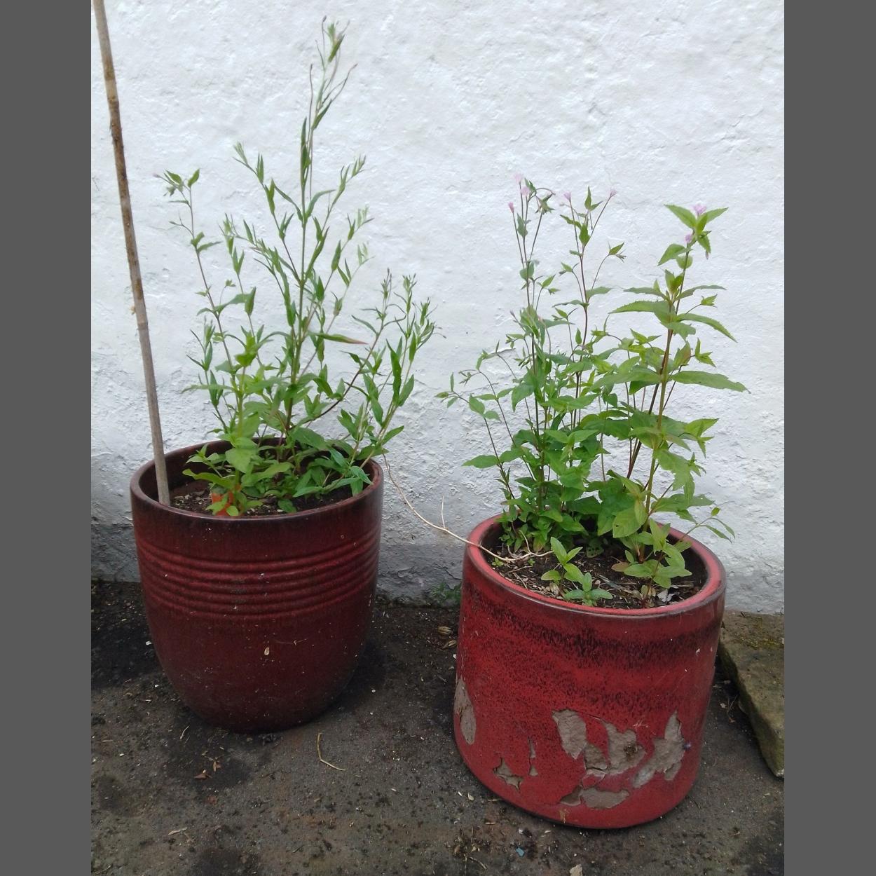 Two garden planters in a cheery red with contents, taller 32cm approx