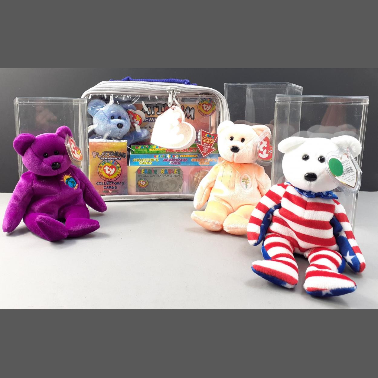 A collection of TY BEANIE BABIES to include a Beanie Babies platinum membership pack, and a boxed Mother's Day Beanie Baby, Millennium and Liberty all with tags