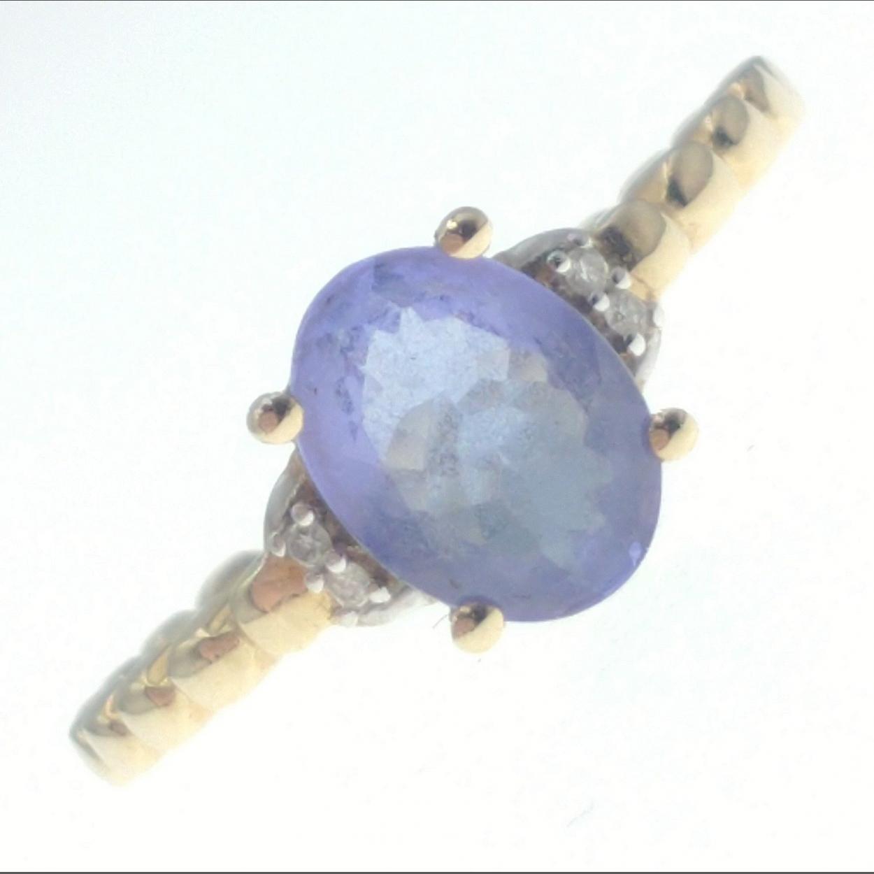An attractive 10K marked TGGC ring with pretty amethyst coloured central stone, size O, gross weight 1.8g approx