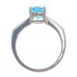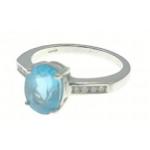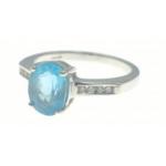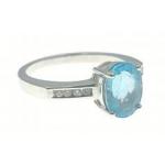 A 375 hallmarked white gold ring set with 4 small diamonds on each shoulder and an appealing central aqua marine blue stone, size O, gross weight 4g approx