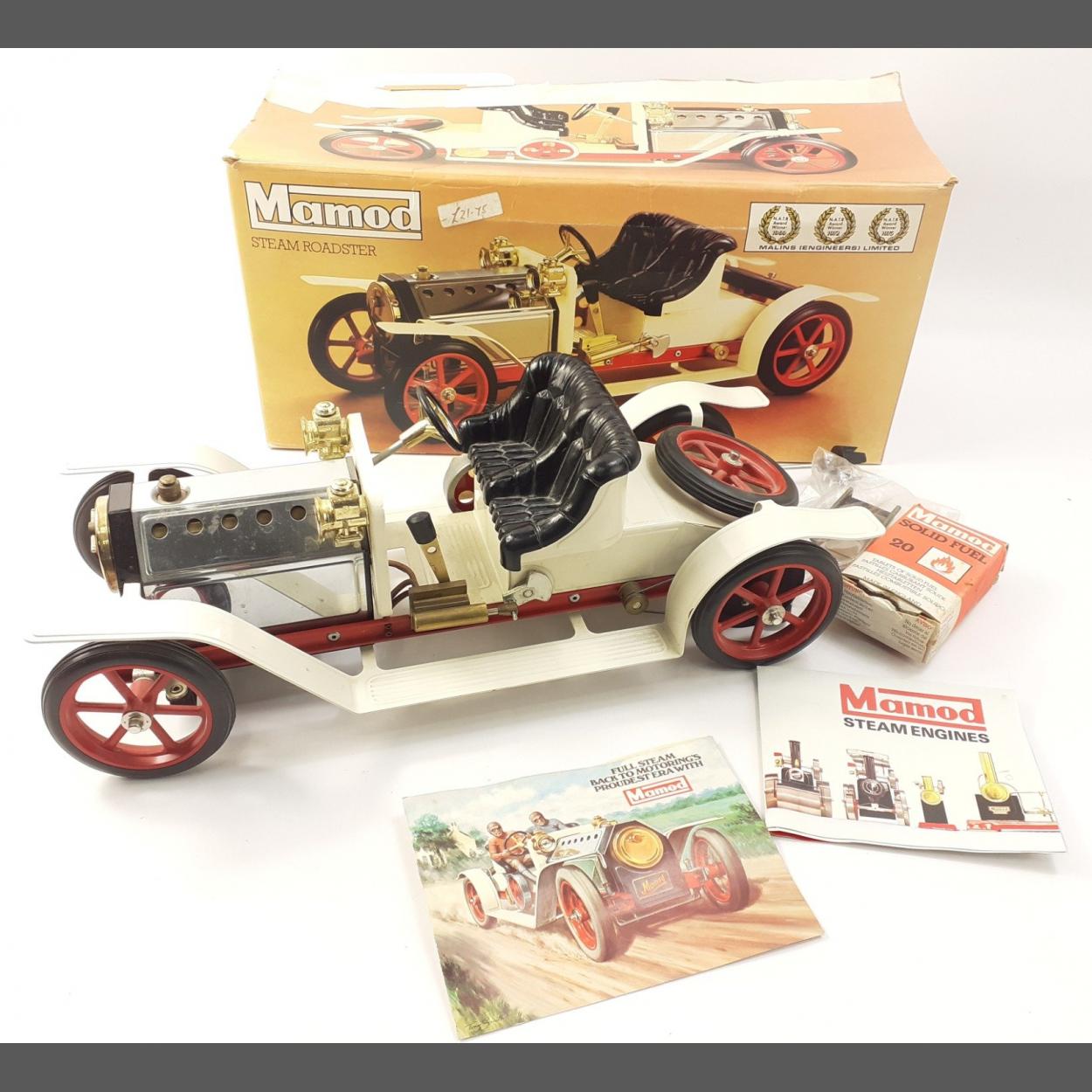 A MAMOD Steam Roadster SA1 in original box with accessories, booklet and steering rod. Fired once and put away. Box has wear but model in excellent order.