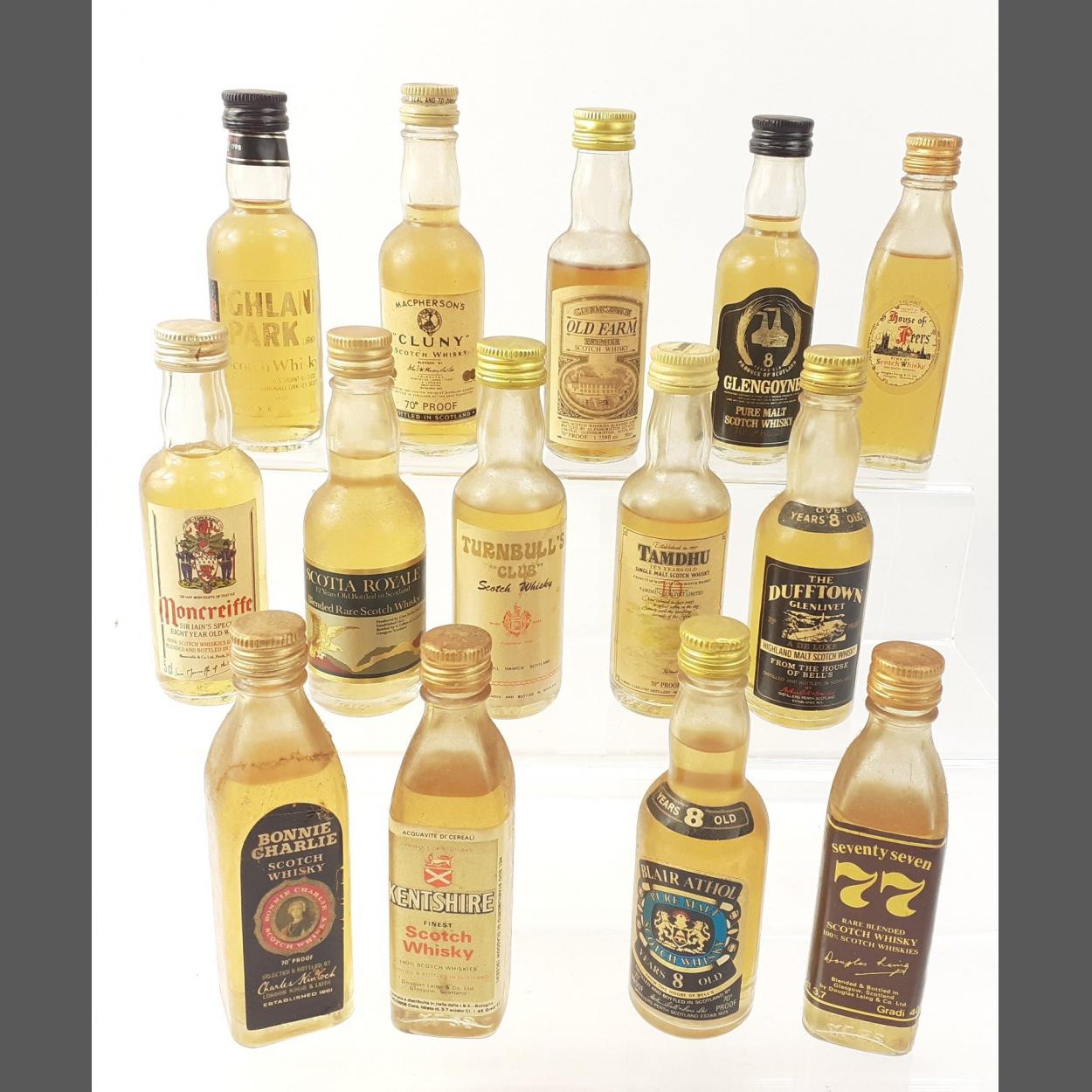 A small selection of 14 interesting whisky miniatures to include McPhersons Cluny, Turnbull's Club, Blair Athol, Moncreiffe, Tamdhu etc.