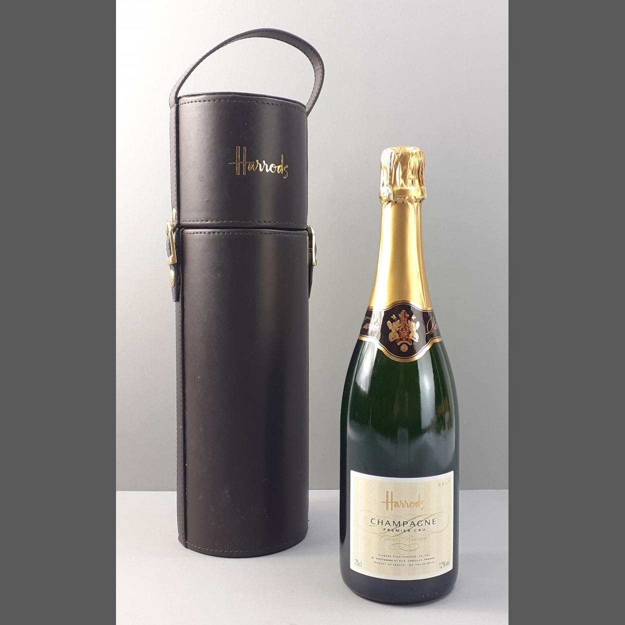A bottle of HARRODS Champagne with a leather look bottle carrier