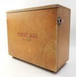 A wooden c1950s FIRST AID box - dimensions 28cm x 22cm x 13cm depth approx