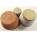 Three very attractive studio pottery vases, two with attractive designs, one earth pottery. Two of the vases stand 15.5cm tall approx, the smaller vase stands 9cm tall approx.