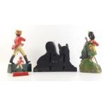 Bar advertising to include BLACK & WHITE dogs which can be wall-mounted 26x21cm approx, a wooden JOHNNIE WALKER on a plinth 25x12cm approx, a worn DEWAR'S piper 25x11cm approx, a small plastic JOHNNIE WALKER with damage 10cm high approx