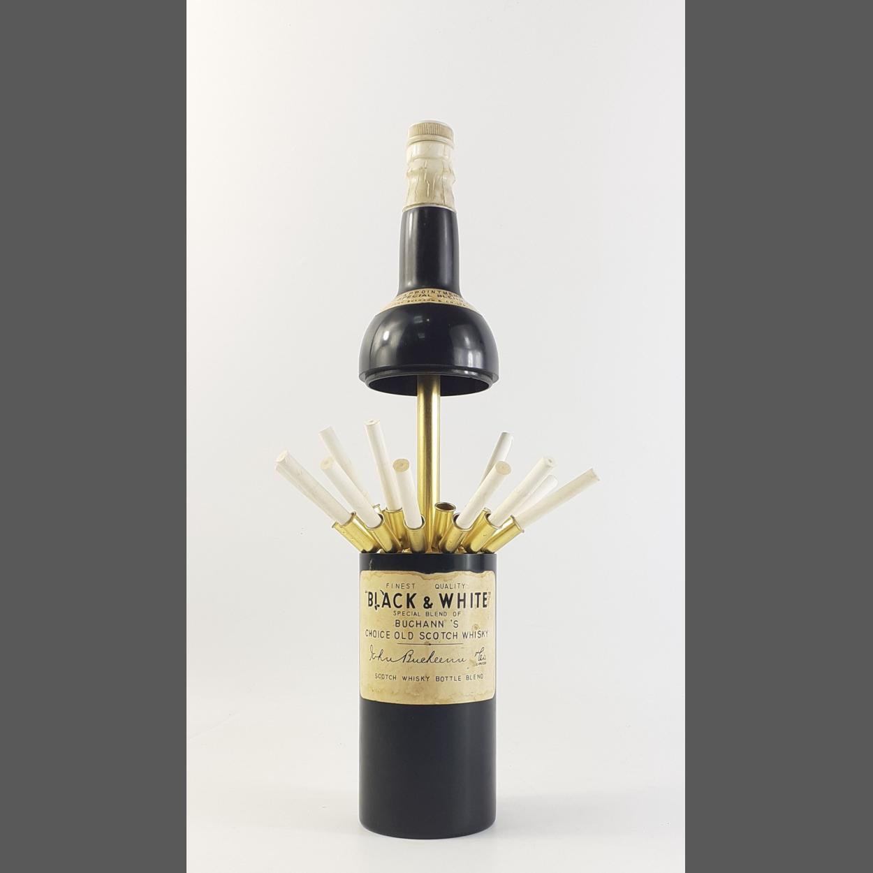 A novelty BLACK & WHITE musical cigarette dispenser in the shape of a whisky bottle, stands approx 29cm tall