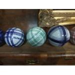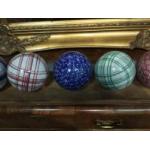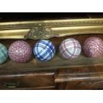 A set of 13 ceramic indoor bowls believed to be WEMYSS, with a display plank with holes for the bowls to sit