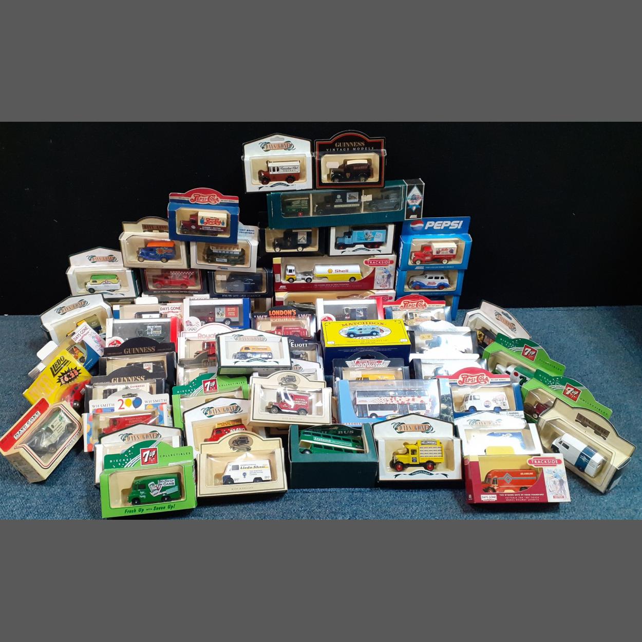 A box of collectable car models to include several each of 7UP and Guinness, MATCHBOX 1937 GMC van Chester Toy and Doll Museum and many more