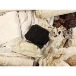 A collection of vintage lace of varying lengths and widths plus some hand-crocheted black squares.