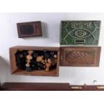 A mixed lot to include a part quality wooden chess set, some sheet music, a tin box with keys, printer's block, a 1960s replica Bowery Savings Bank, 4 glass display frames