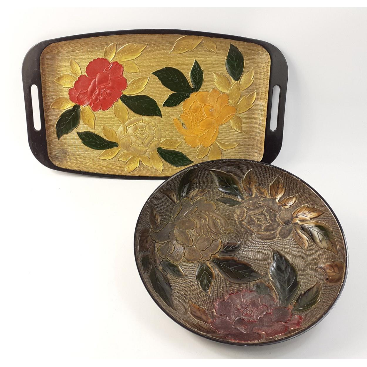 Two very pretty and useful Bakelite trays with an Oriental theme, the larger 45cm across.