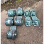 Four blue terracotta lion head plant pot stands plus 5 blue scroll plant pot stands