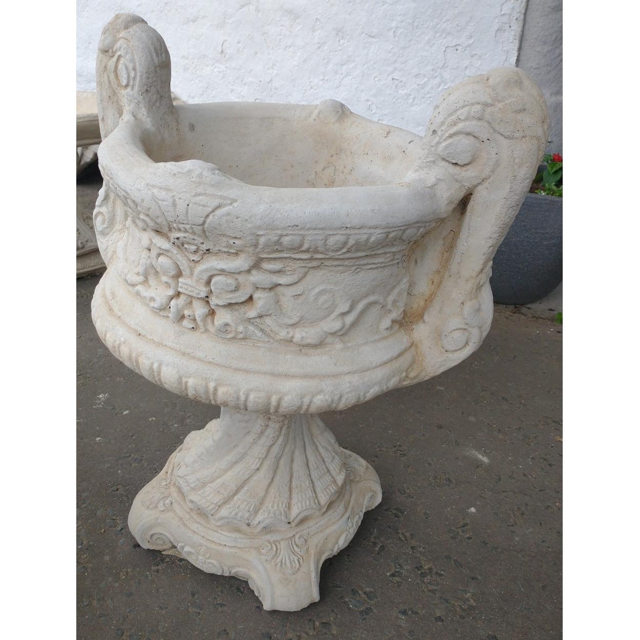 A 2 piece fleur-de-lys design stonework planter on plinth, 43cmW x 40H