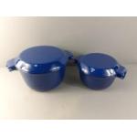 Two Danish NACCO cast iron blue enamel casserole dishes with lids larger has 21cm diameter (tiny chip in lid and some scratches)