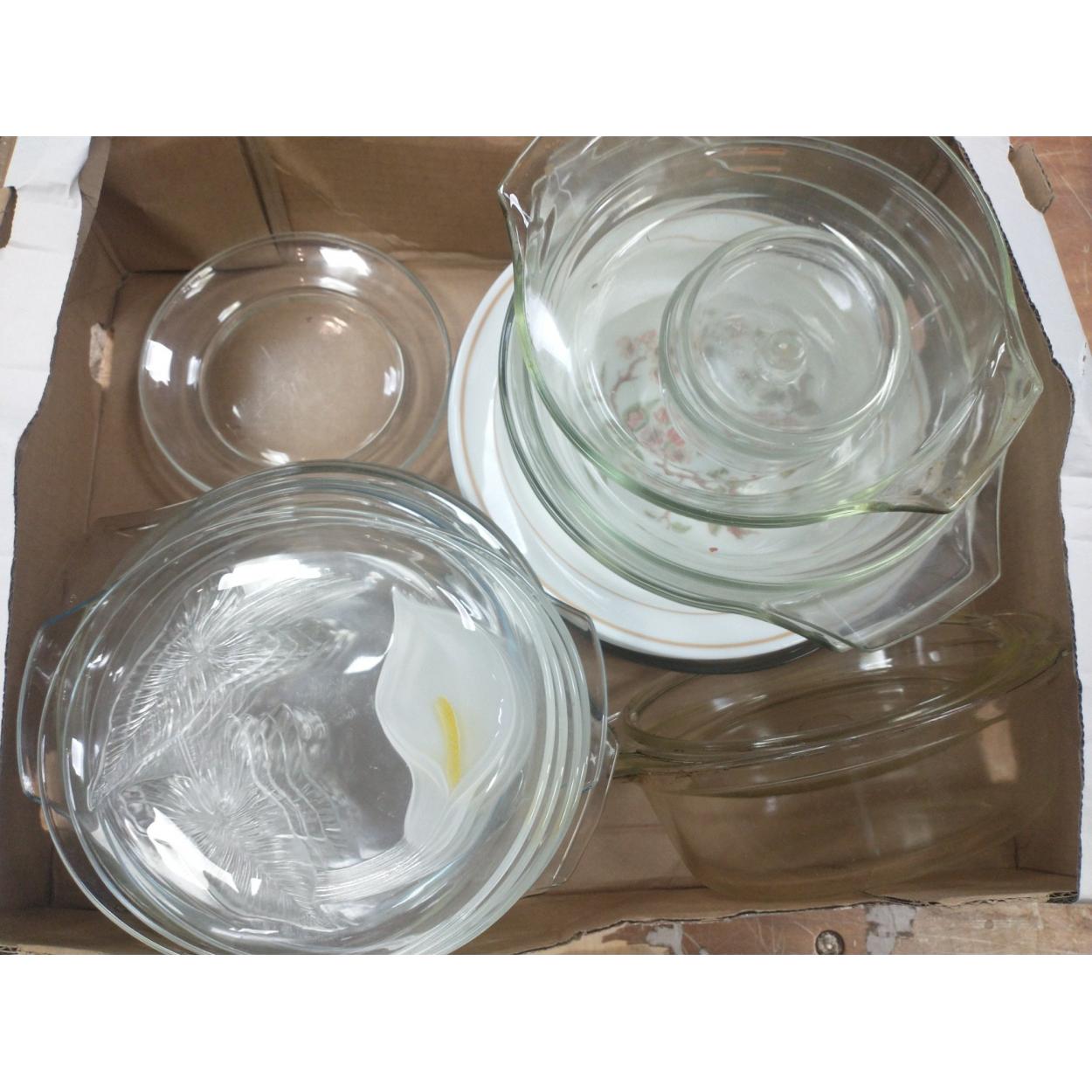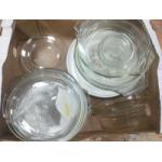 A box of various sized casserole dishes including PYREX plus some clear dinner plates