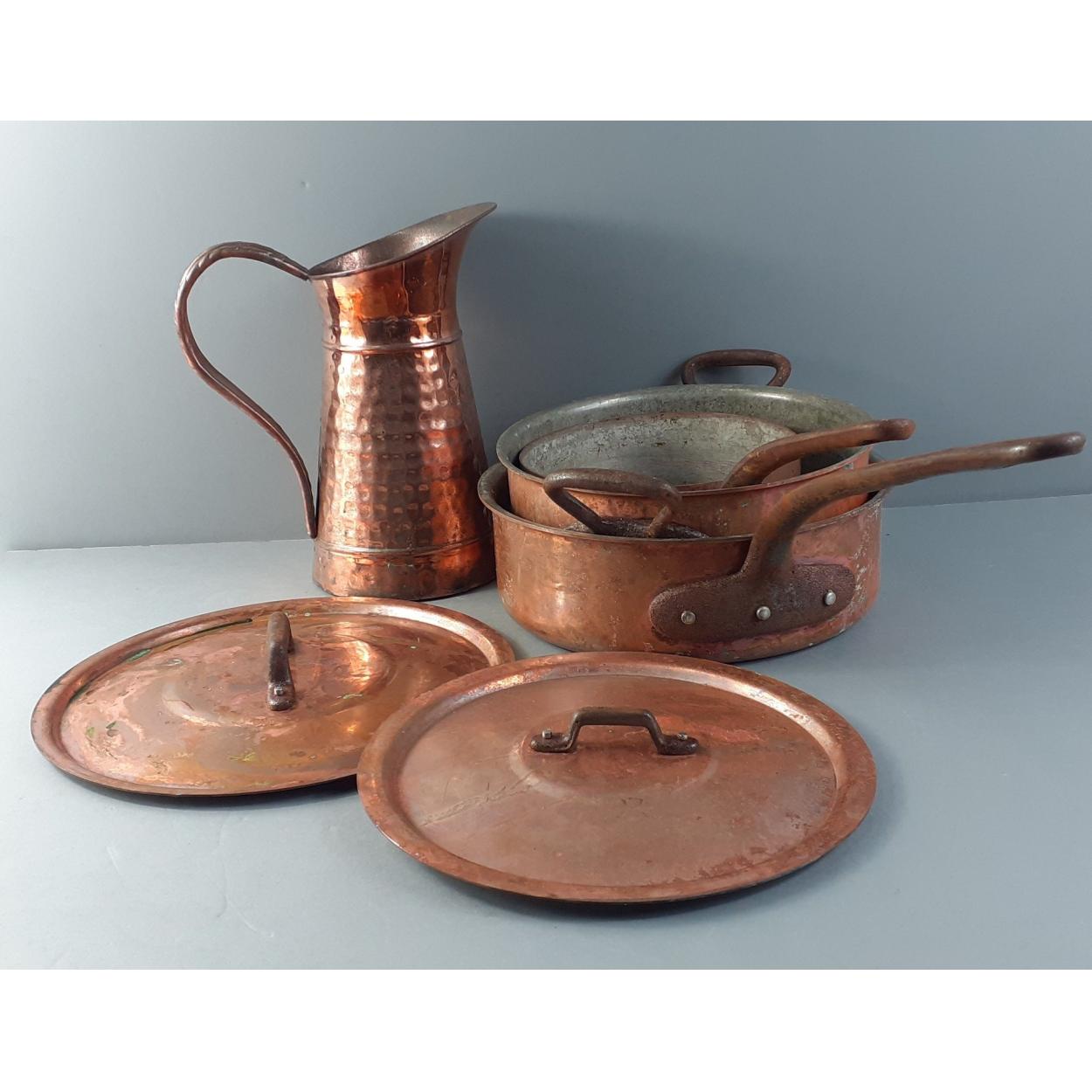 Two NICE QUALITY copper saucepans and one copper double-handled casserole pan. The larger saucepan and the casserole pan have lids together with a copper water jug. Some surface rust to handles.