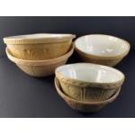 A quantity of MASON CASH ceramic mixing baking bowls . The largest being 29cm across. Lot includes four Masons and one TG Green. The smallest has a chip / crack others are good.