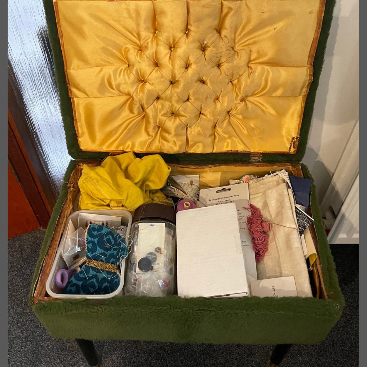 A green velour deep buttoned bedroom chair with a velour pink footstool with lid which also acts as a storage bin