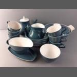A selection of POOLE pottery to include 6 cups, a casserole dish, sauceboat, sugar and cream etc