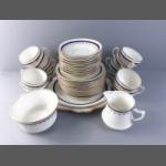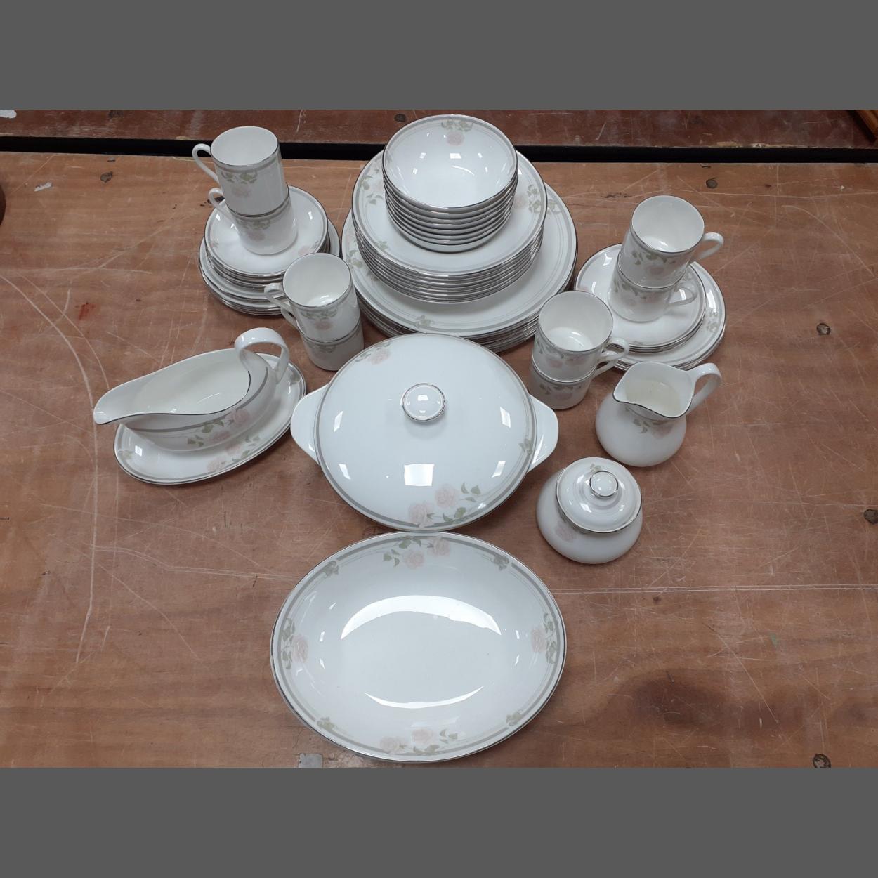 ROYAL DOULTON - A Twilight Rose tea/dinner service comprising 8 each of dinner plates, dessert bowls, soup bowls, saucers, coffee cups, and side plates, plus 2 serving bowls, 1 sauceboat with underplate, 1 covered serving dish, 1 milk jug and 1 sugar bowl. Minor rubbing to the gilt in places, otherwise in good condition