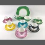 A STANLEY bone china Harlequin tea set to include 6 cups, 4 saucers, 6 side plates, 1 cake plate, 1 milk jug and 1 sugar bowl