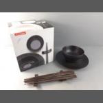 A black TYPHOON boxed Chinese dinner service for four comprising 4 each of dinner plates, rice bowls, spoon, sauce dish, pairs of chopsticks and chopstick rests. Purchased from Jenners