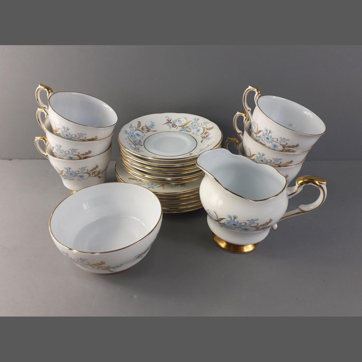 A part COLCLOUGH Braganza tea set to include 2 cups, 6 side plates, 6 saucers, 1 cake plate, 1 teapot and a sugar bowl. No visible damage