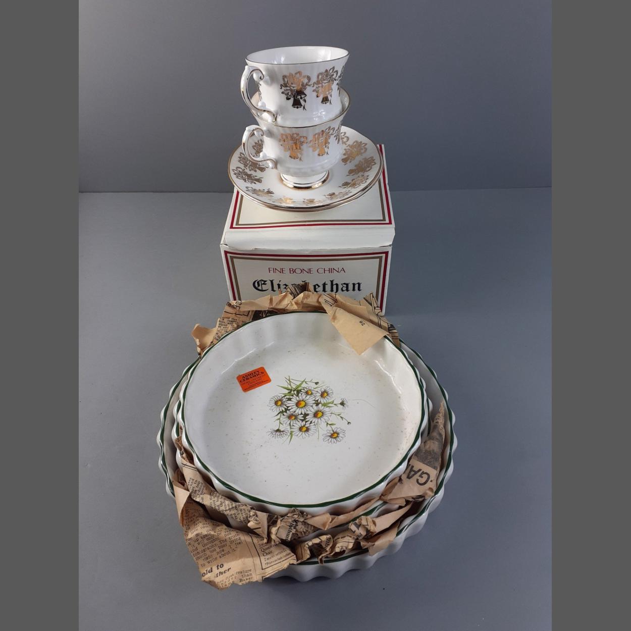 A ceramic lot to include fine bone china Gold Wedding 50th anniversary teacup set for 2, and 3 ASHLEY ceramic graduated flan dishes largest being 22cm dia