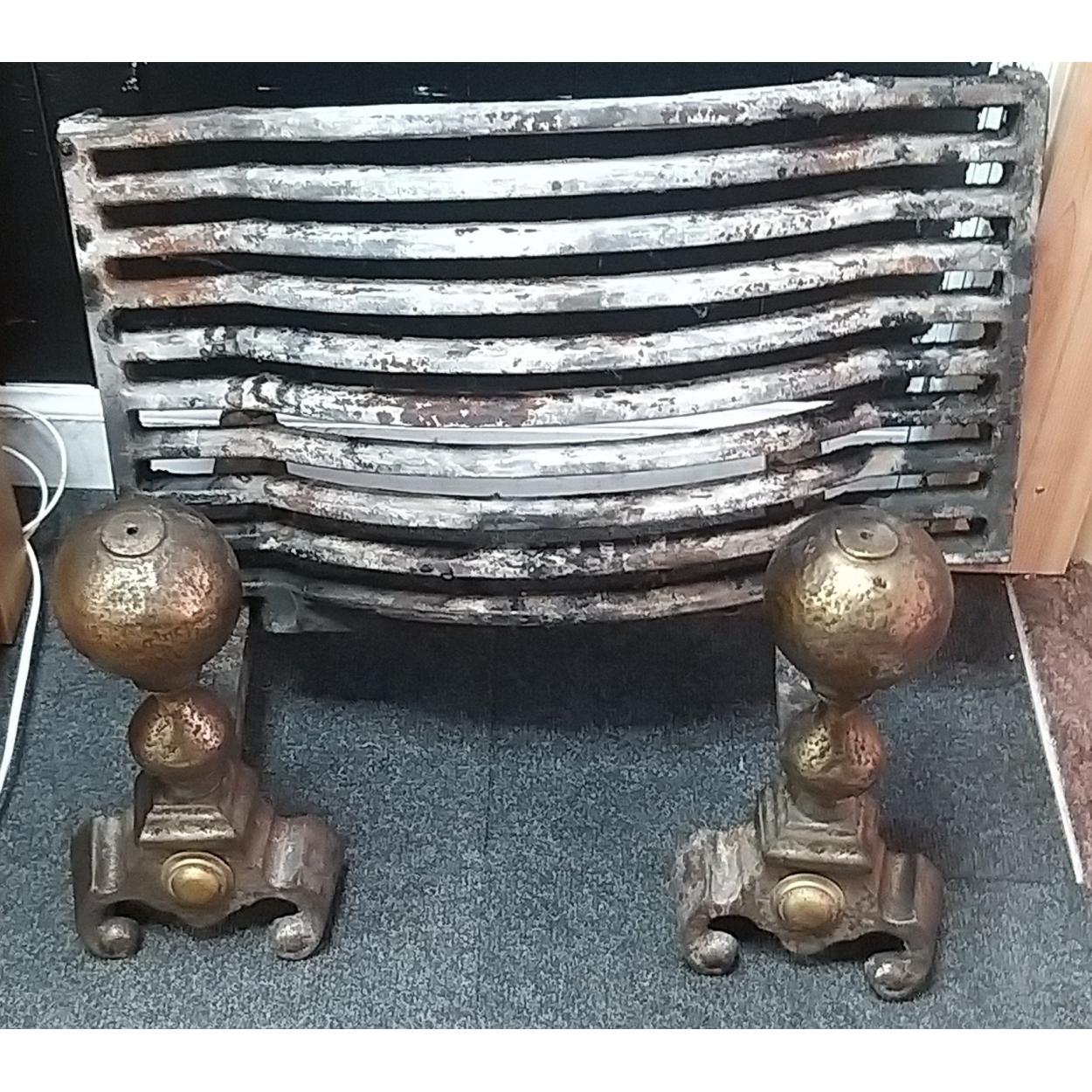 Large fire grate and fire dog end pieces with large sculpted brass ends.