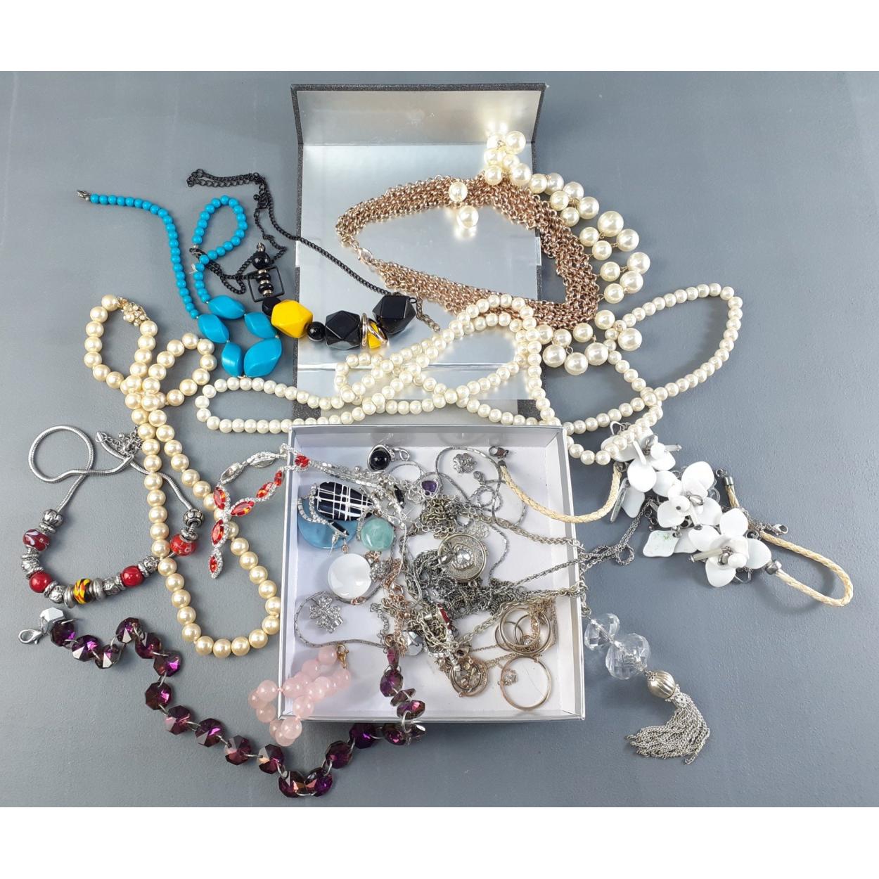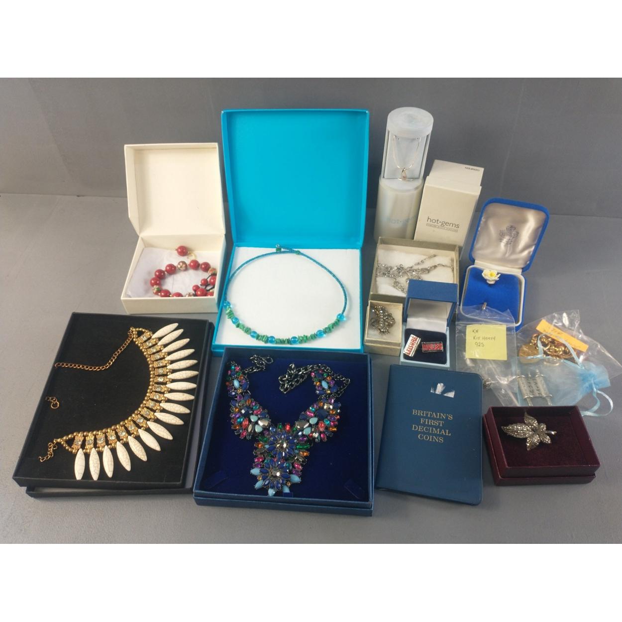 A good collection of attractive individually boxed jewellery to include sterling silver Marcasite necklace, Hot Gems silver pendant, Aynsley ceramic tie pin, Shriya bracelet beads with matched earrings, stone beads, Silver Marcasite leaf brooch, super large M&S floral assembly and others.