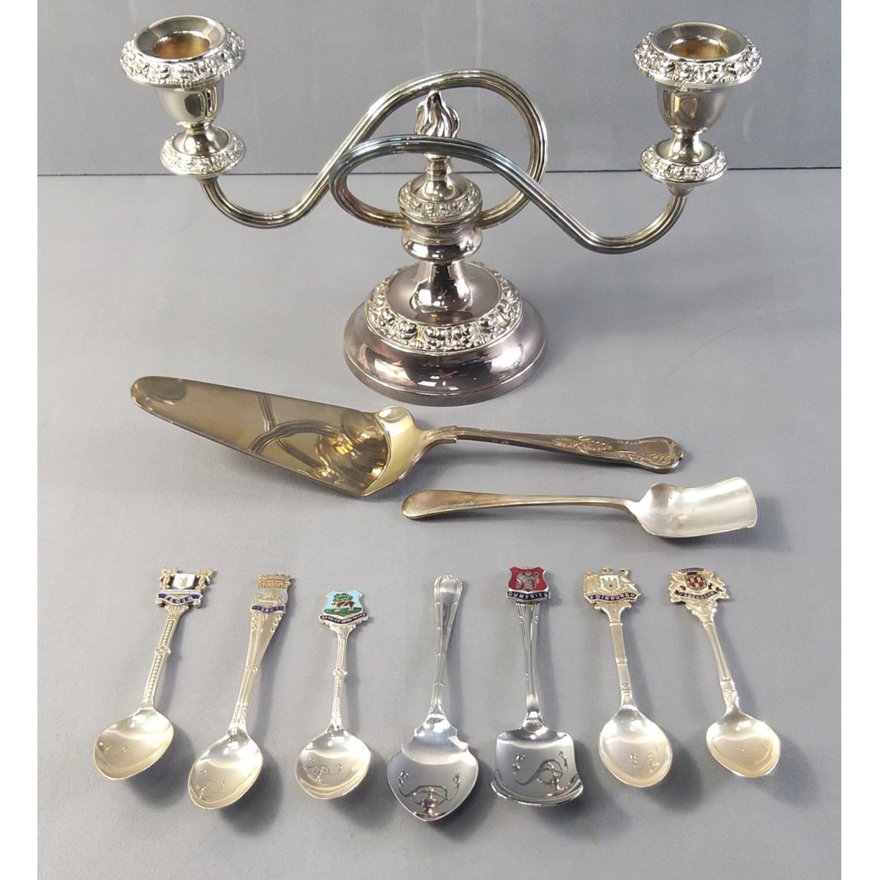 A small silverware lot to include a twin-branch candelabra, a cake slice, 6 crested spoons and 2 others.
