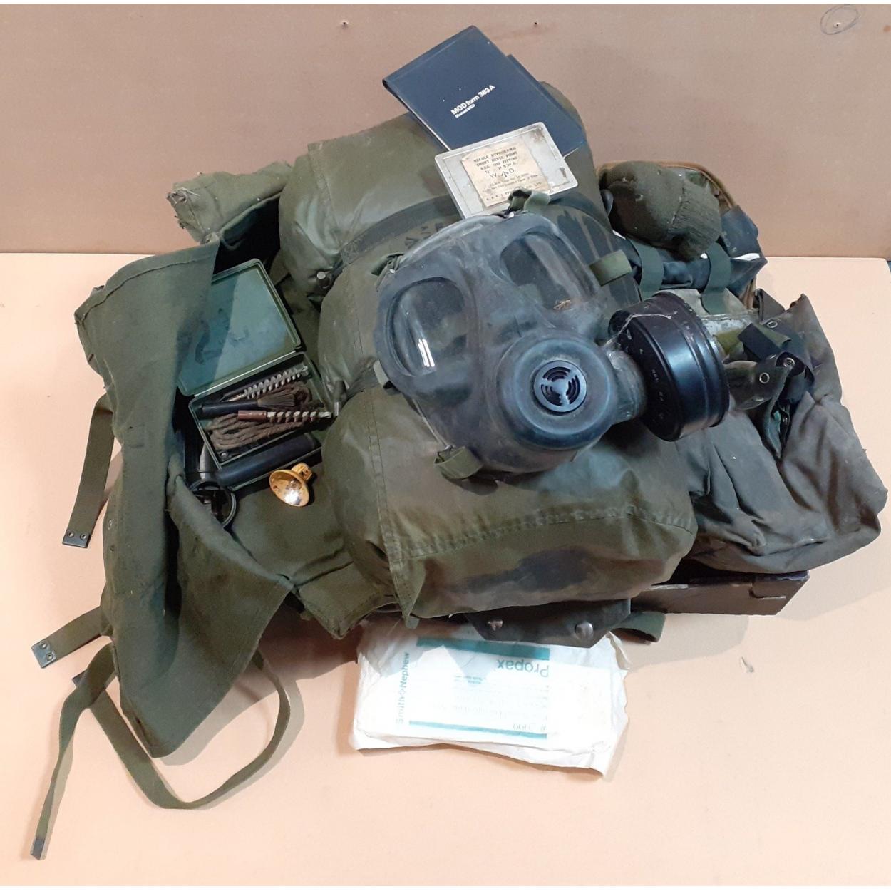 MILITARY KIT. Includes vintage gas mask, water bottle, sleeping bag, ponchos, hessian carry bag, torch, personal kit etc. A good interesting lot.