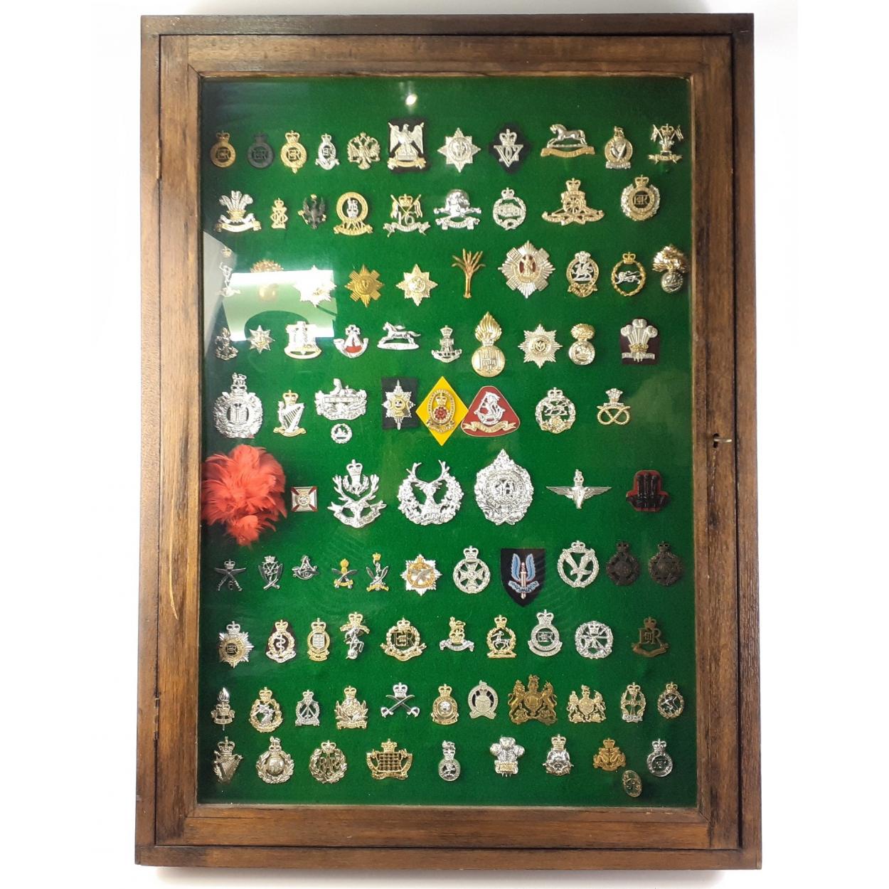 An impressive collection of over 90 BRITISH ARMY Cap Badges in a wonderful display case (82cm x 59cm approx). Many Staybrite QEII but some earlier as well. A super collection well presented.
