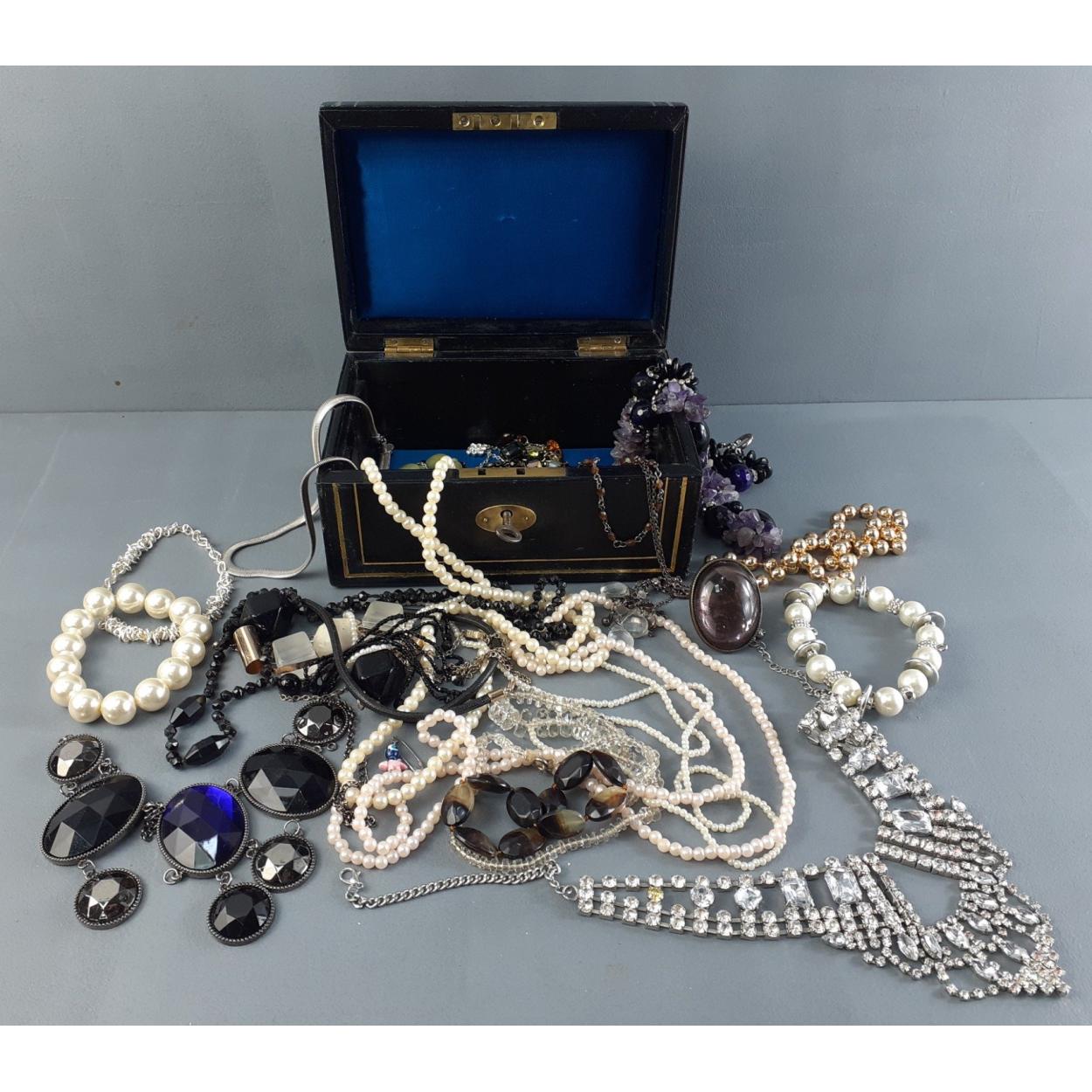 A really nice old Moroccan leather jewellery chest with key and recessed handle. Full of interesting beads, necklaces etc.