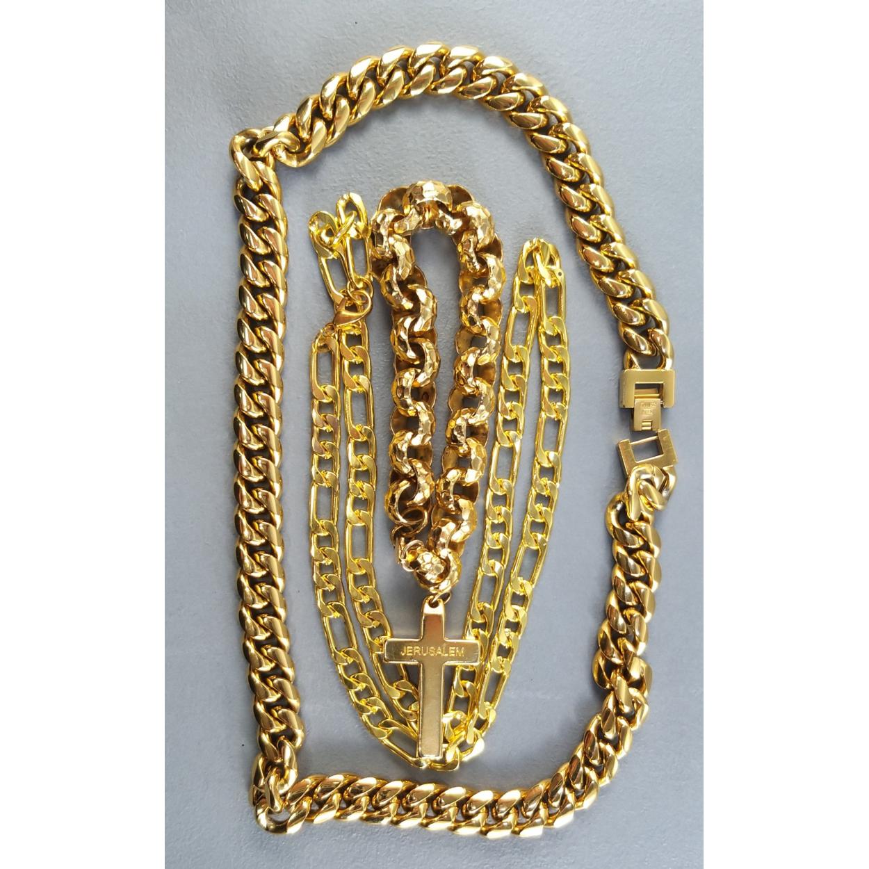 HIP HOP Rapper bling. A large link Cuban chain by KRKC & Co, a link chain, a circular hoop bracelet and an INRI Jerusalem cross.