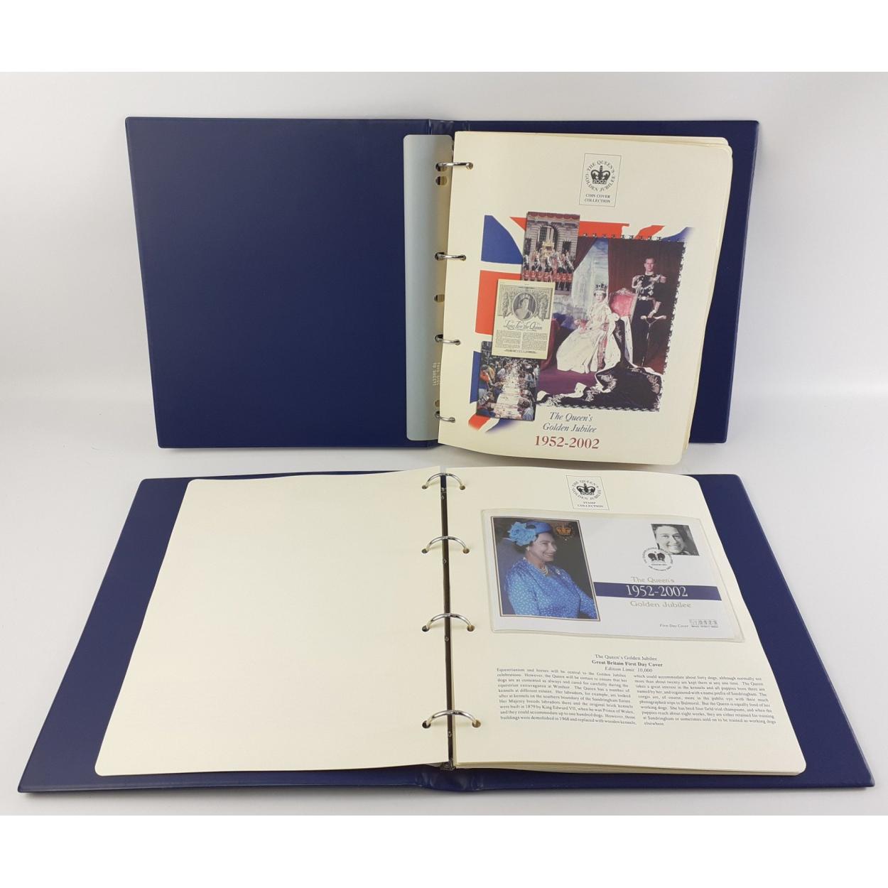 Plush WESTMINSTER MINT STAMPS & COINS albums filled with royal interest THE QUEENS GOLDEN JUBILEE. Each sleeve contains stamp cover with coin. The Royal Family album numbered 1309 contains 16 Crown / £5 Coins from around the Commonwealth. Also another album from the series with FDC First Day Covers and stamps.