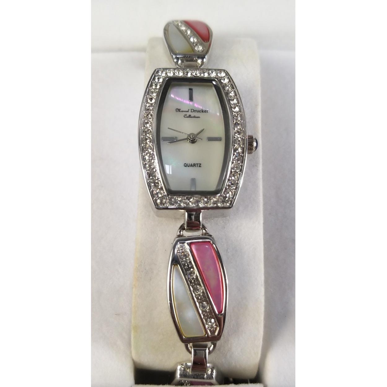MARCEL DRUCKER watch in box. Attractive ladies cocktail watch with faux diamonds and mother of pearl face. Stylish attractive modern quartz watch. Working well at valuation, spare link in box.