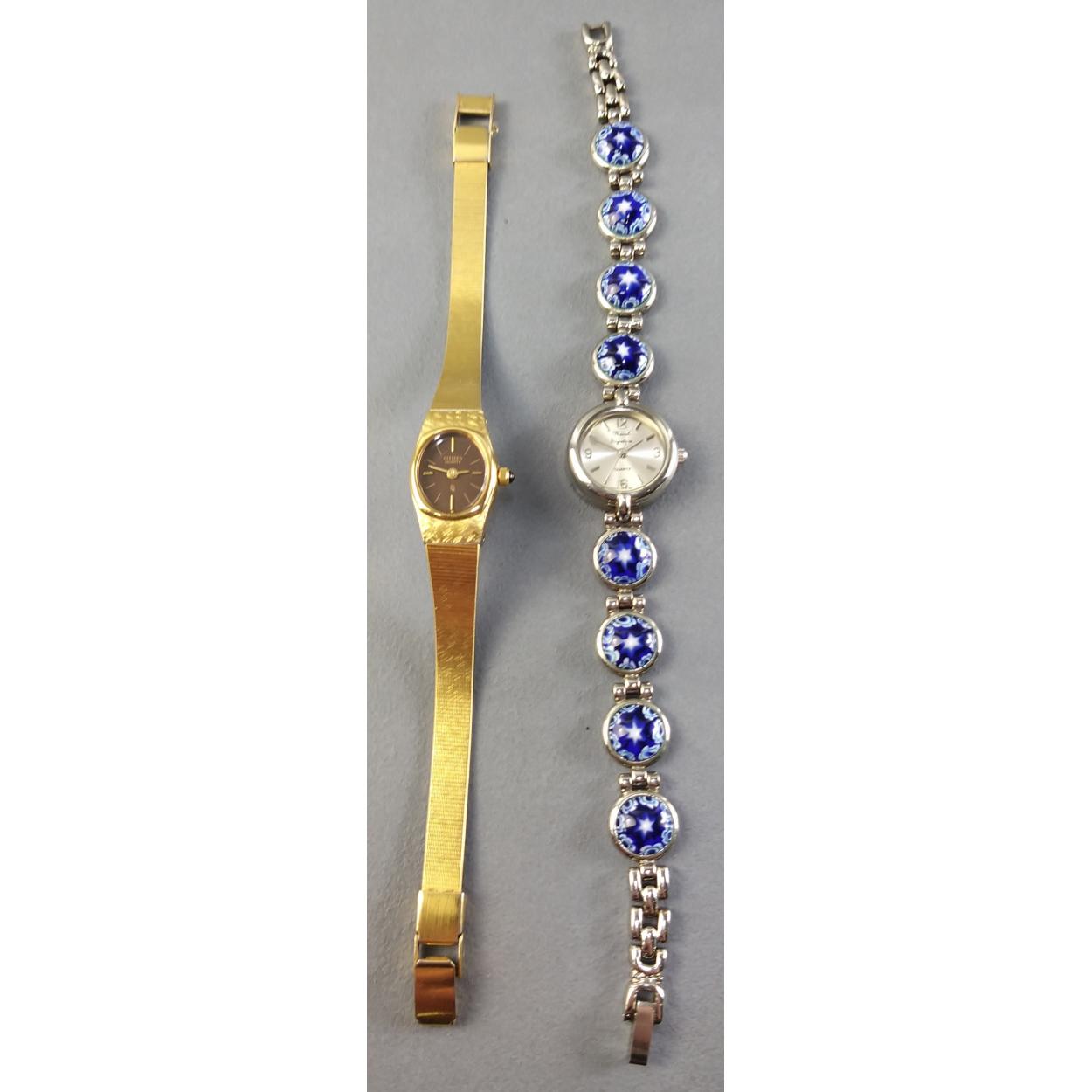 MARCEL DRUCKER Ladies cocktail watch in box with blue and white Millefiori glass panels on silver effect bracelet. Also a ladies CITIZEN gilt band cocktail watch. May require batteries.